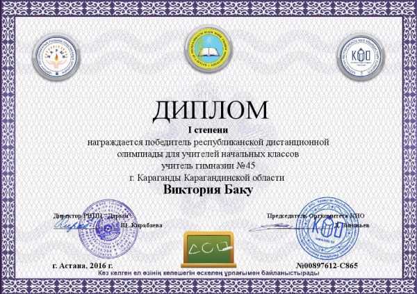 Так по итогам олимпиады дипломом 1 степени РНПЦ «Дарын» награждена Баку Виктория Тимофеевна, учитель начальных классов гимназии № 45