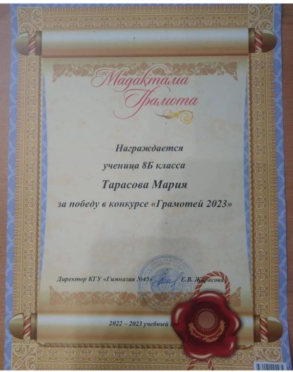 Ученица 8 б класса,Тарасова Мария,победила в конкурсе «Грамотей 2023». Поздравляем!