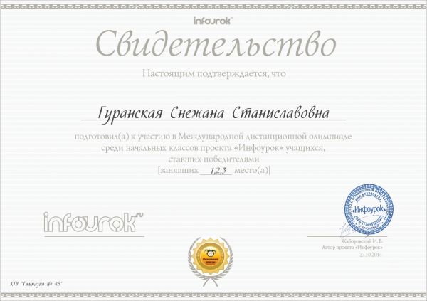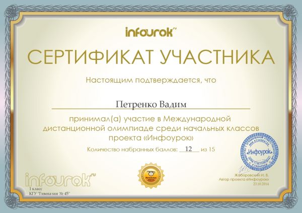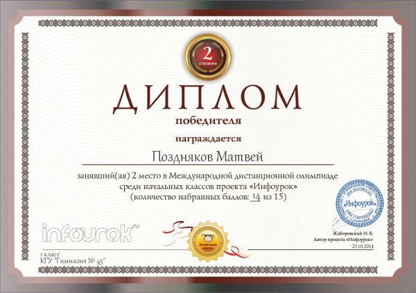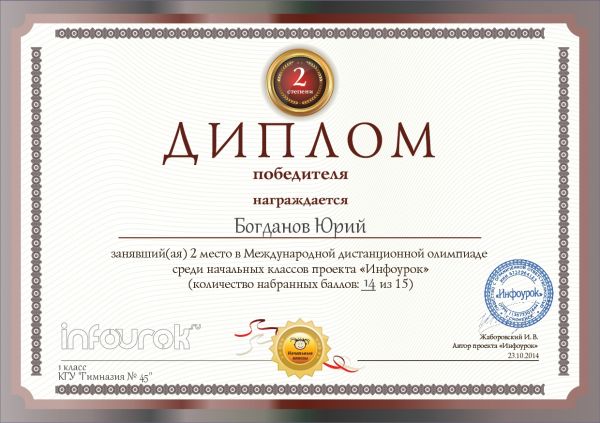 Результаты участия учащихся 1-Б класса в Международной дистанционной олимпиаде среди начальных классов проектов «Инфоурок», зима (февраль)2014/2015