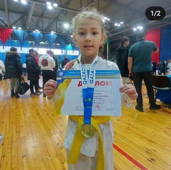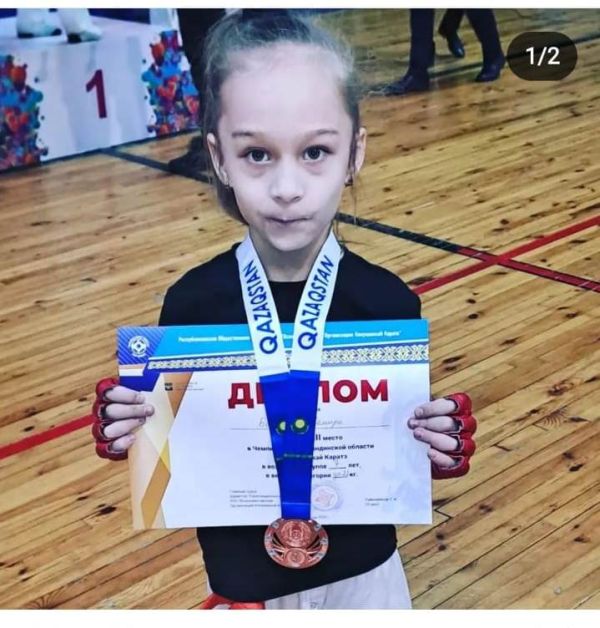Басырова Дарина, ученица 2 Б класса. Чемпионат Карагандинской области по Кекушинкай каратэ. Заняла первое место в весовой категории до 25кг. Поздравляем!!!!