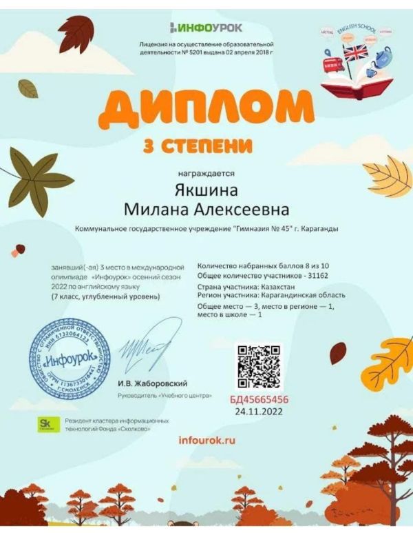 Поздравляем! Якшину Милану 7Б класс.
