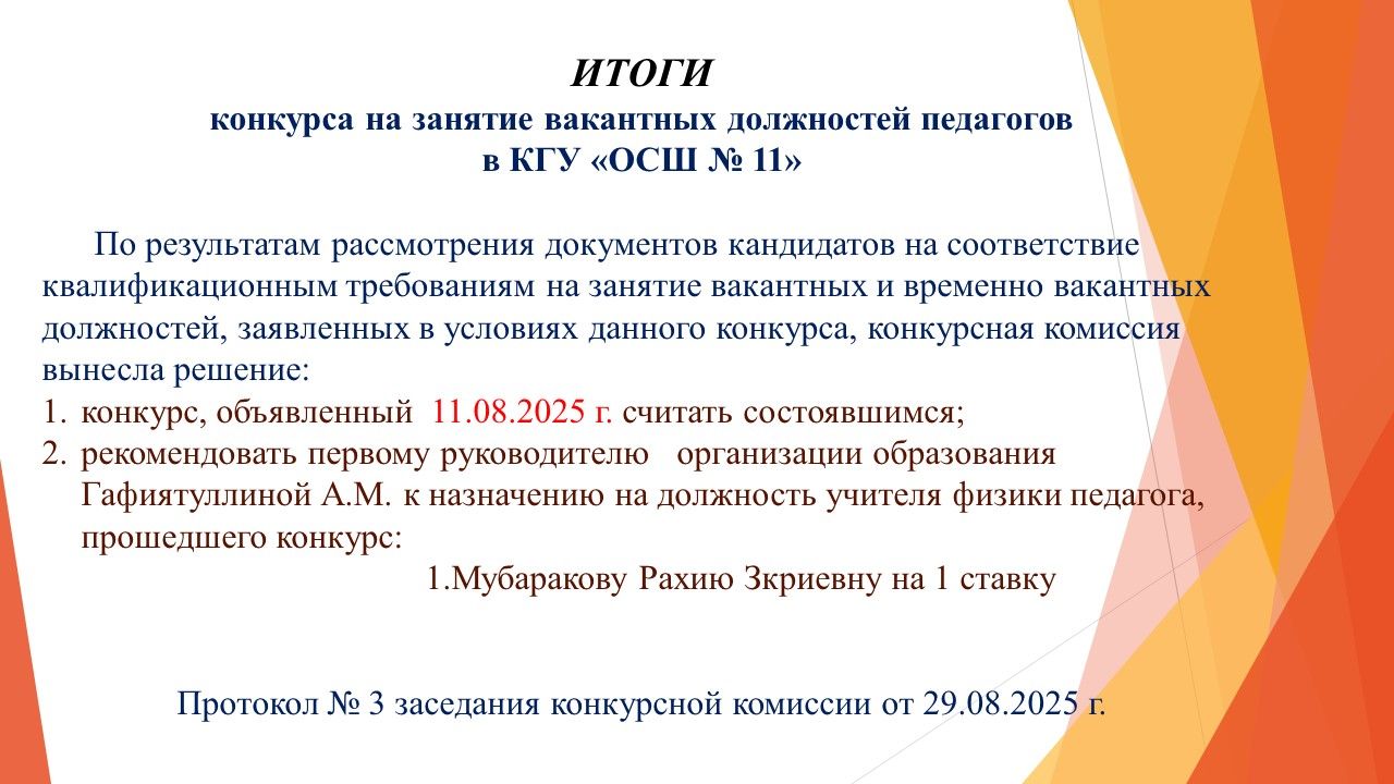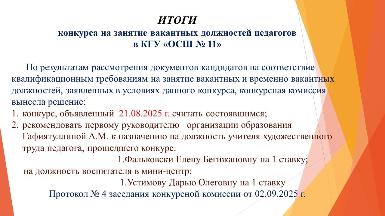 ИТОГИ конкурса на занятие вакантных и временно вакантных должностей педагогов в КГУ «ОСШ № 11»