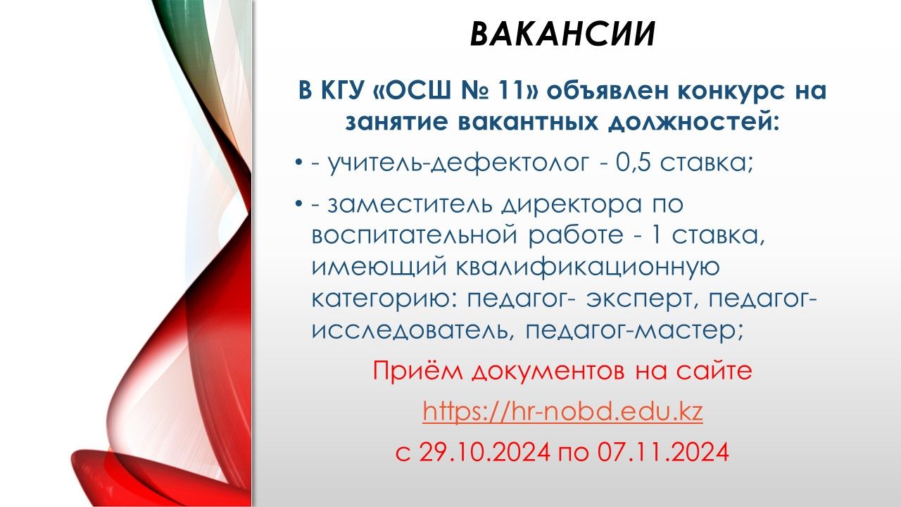 В КГУ «ОСШ № 11» объявлен конкурс на занятие вакантных должностей:
