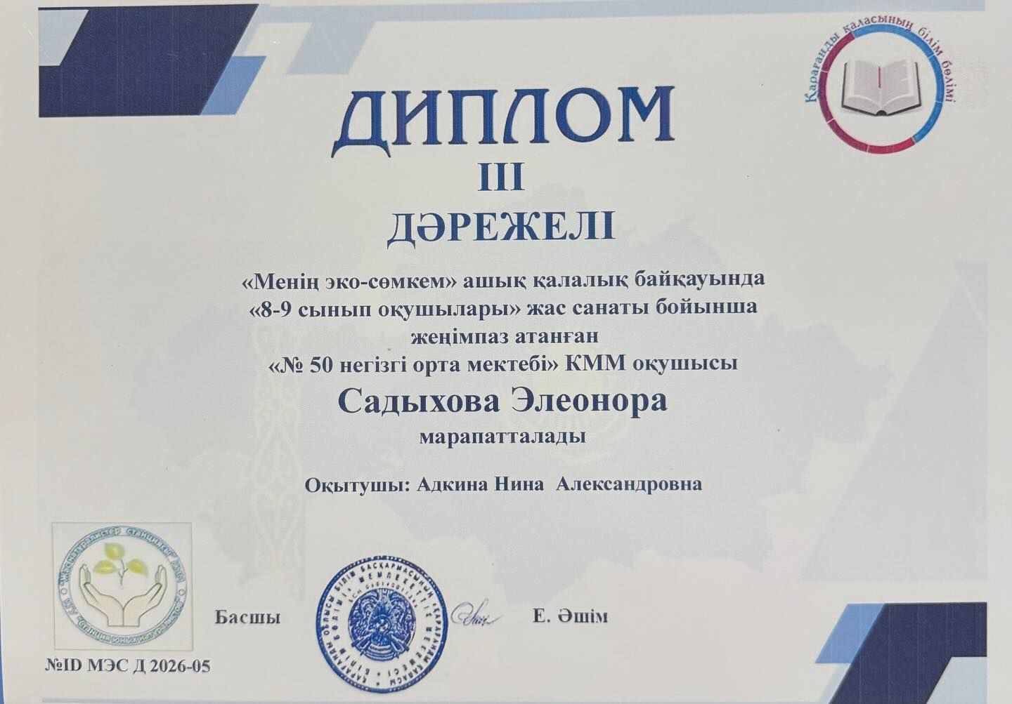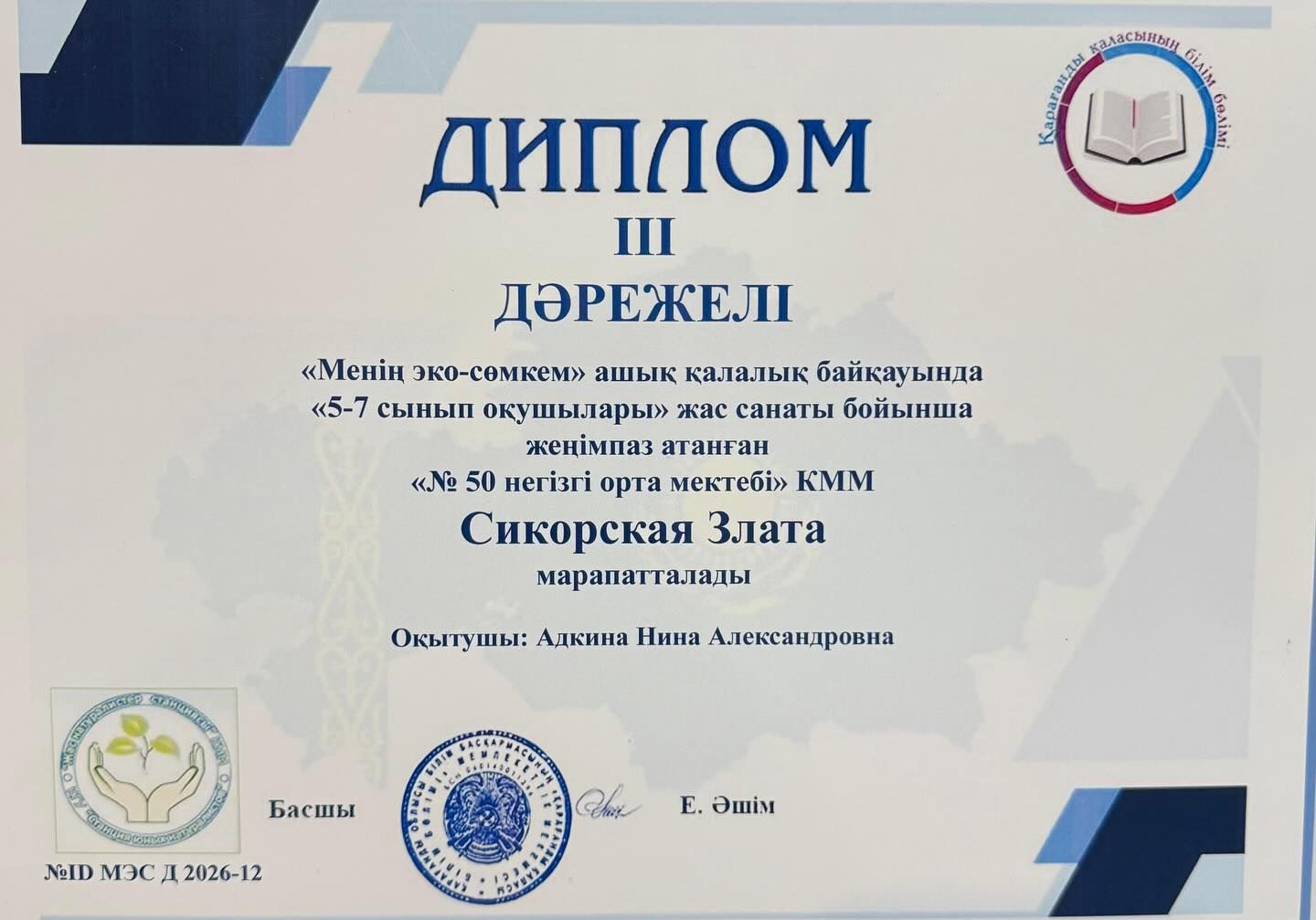 Поздравляем наших учеников с получением дипломов в городском конкурсе “Менің эко-сөмкем”