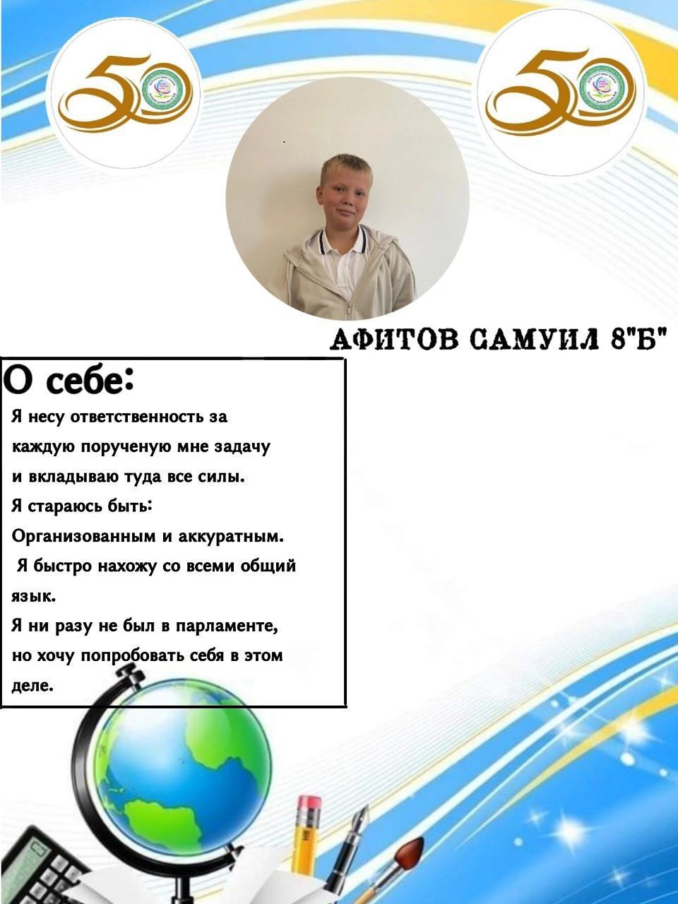Кандидат в Президенты школы, ученик 8 Б класса Афитов Самуил