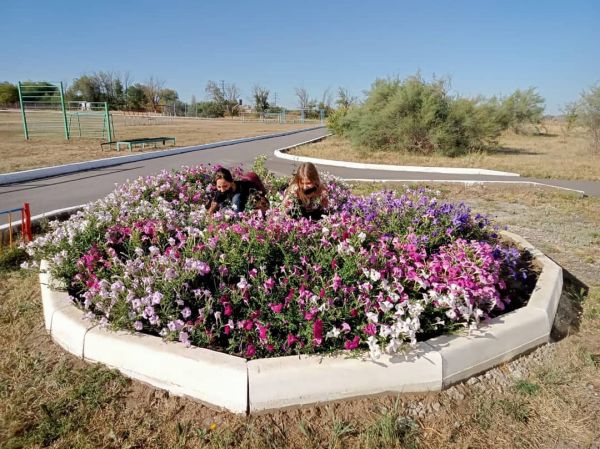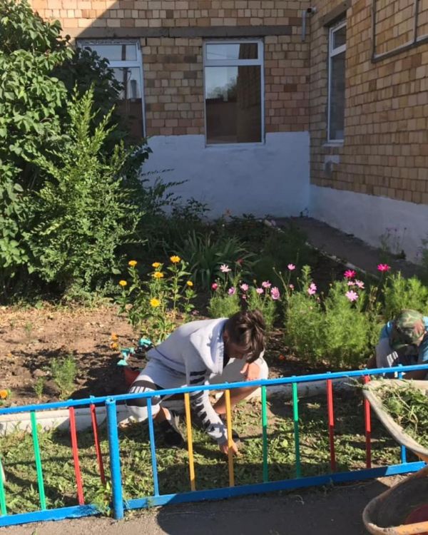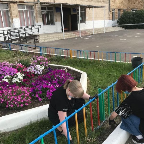 26.06-27.06 ребята 6 б класса зелёного патруля трудятся в ярком летнем цветнике возле нашего школьного двора