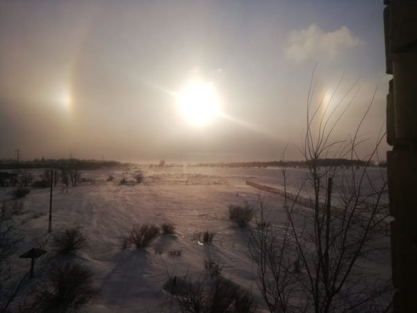 Сегодня ученики нашей школы наблюдали, как садится солнце, при этом вокруг него проявилась радуга, на научном языке это явление именуется ореолом.