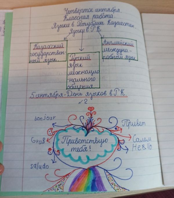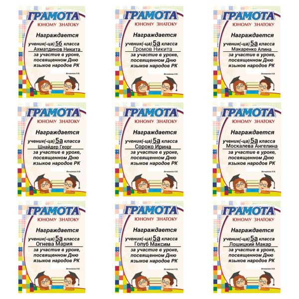 9 сентября учащиеся 5а и 5б класса были награждены учителем русского языка и литературы почетными грамотами за участие в уроке, посвященном Дню языков народов Казахстана.