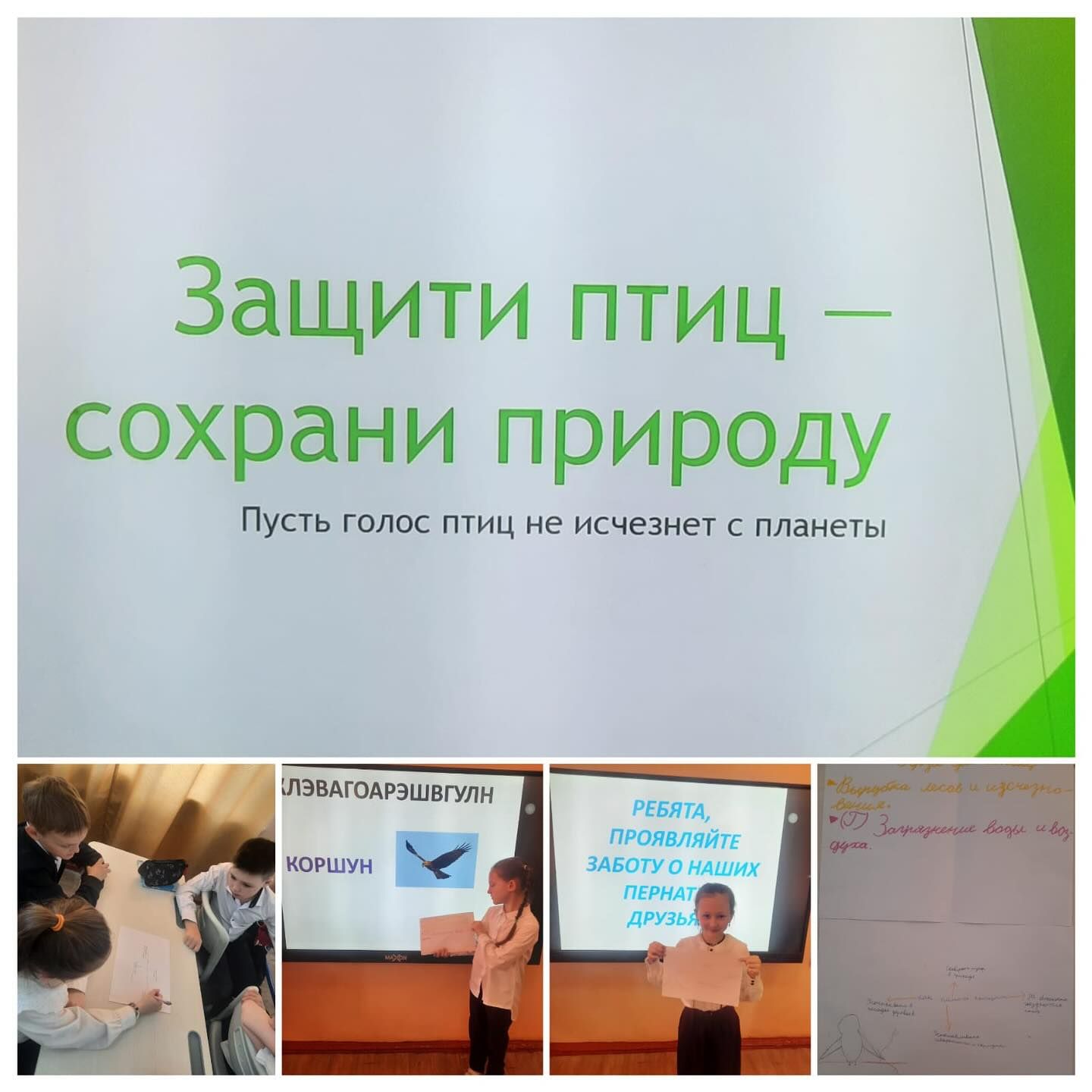 14.04 в рамках Недели экологии “Чистый Казахстан” для учеников 3 б класса был проведен классный час на «Защити птиц- сохрани природу”. Ребята узнали много нового о птицах, выяснили, какую пользу приносят пернатые друзья, обсудили как можно им помочь, пора
