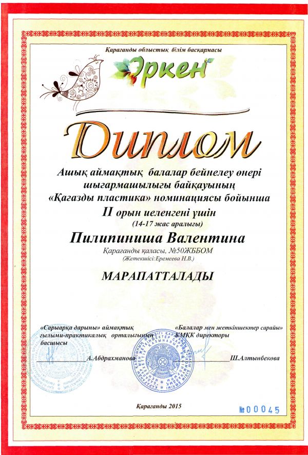 "Сарыарқа дарыны" аймақтық ғылыми - практикалық орталығының ұйымдастыруымен ашық аймақтық балалар бейнелеу өнері шығармашылығы байқауына №50 негізгі орта мектебінің 8б - сынып оқушысы Пили…