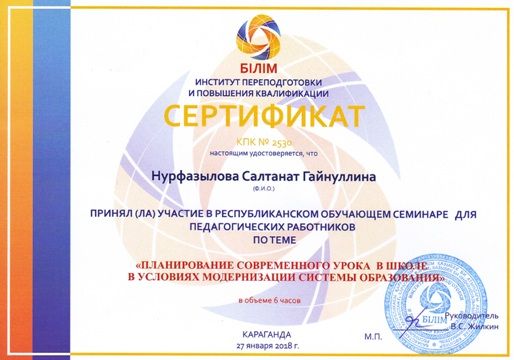 "Планирование современного урока в школе в условиях модернизации системы образования" Республикалық оқыту семинары
