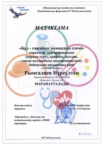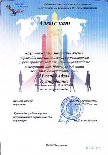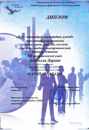 4А сынып оқушысы Жақан Жақсылық Кекушинскай карате бойынша "Жас канат" ашық біріншілігінде І орынды иеленгені үшін дипломмен марапатталды.