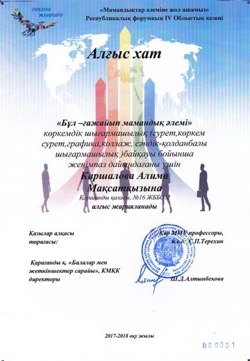 Мектебіміздің оқушылары "Бұл ғажайып мамандық әлемі" көркемдік шығармашылық (көркем сурет, графика, коллаж, сәндік-қолданбалы шығармашылық) байқауына қатысып, жүлделі орындарға ие болды. Ж…