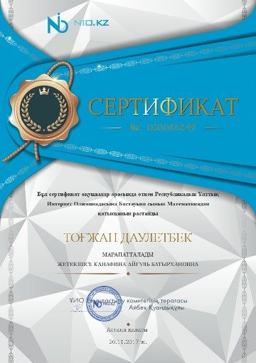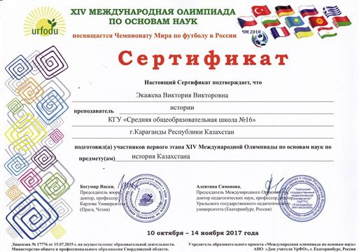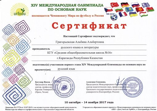 Ғылым негіздері бойынша XIV халықаралық олимпиадада келесі мектеп мұғалімдері сертификатпен марапатталды.