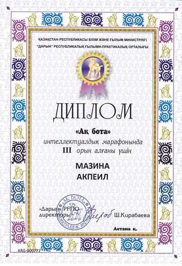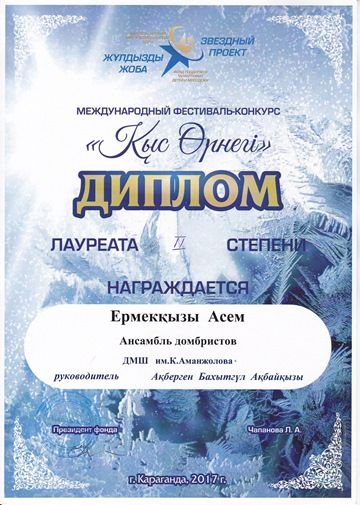 Халықаралық "Қыс өрнегі" фестиваліне қатысқан 4А сынып оқушысы Кульжанова Мадина І дәрежелі дипломмен, 3Ә сынып оқушылары Ермекқызы Асем, Жаилмин Хамза ІІ, ІІІ дәрежелі дипломдармен марапа…