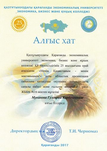 ҚР тәуелсіздігінің 25 жылдығына орай өткізілген "Менің Қазақстаным-менің мақтанышым" атты облыстық презентация сайысына қатысқаны үшін Тельман Ұлықбек сертификатпен марапатталды. Оқушыны қ…