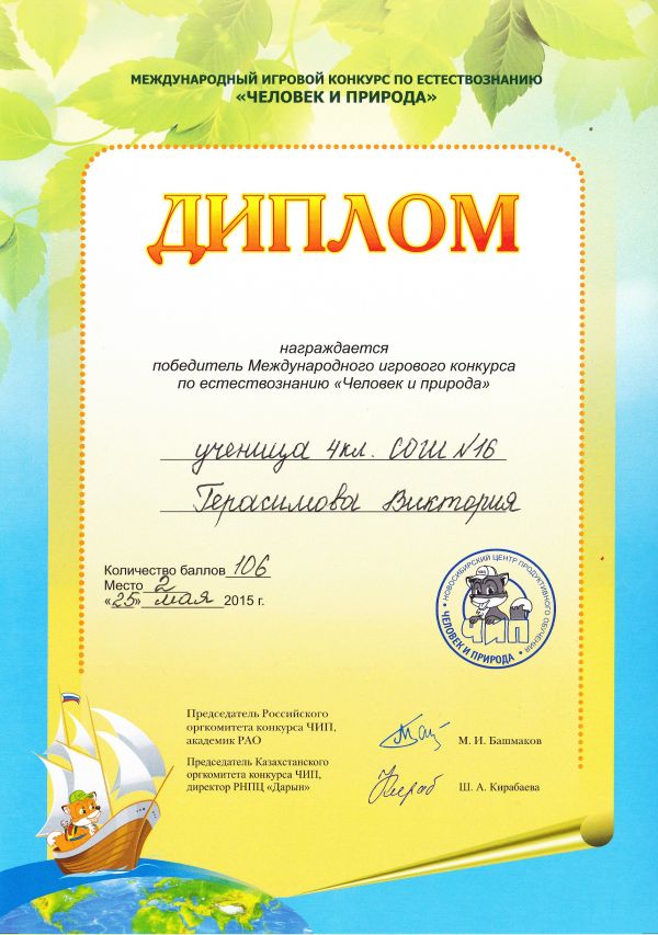 Жаратылыстану пәні бойынша Халықаралық"Адам және табиғат" байқауының жеңімпаздары мен жүлдегерлерін құттықтаймыз