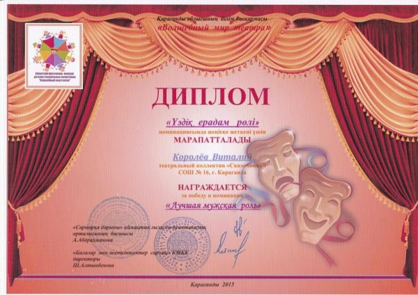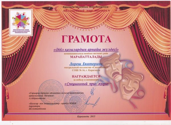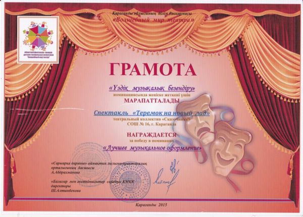 Мектебіміздің "Сказочники" театр ұжымын облыстық мектептік және мектептен тыс білім беретін ұйымдар театр ұжымдарының фестиваль-байқауында ІІІ орынға ие болуымен құтттықтаймыз.