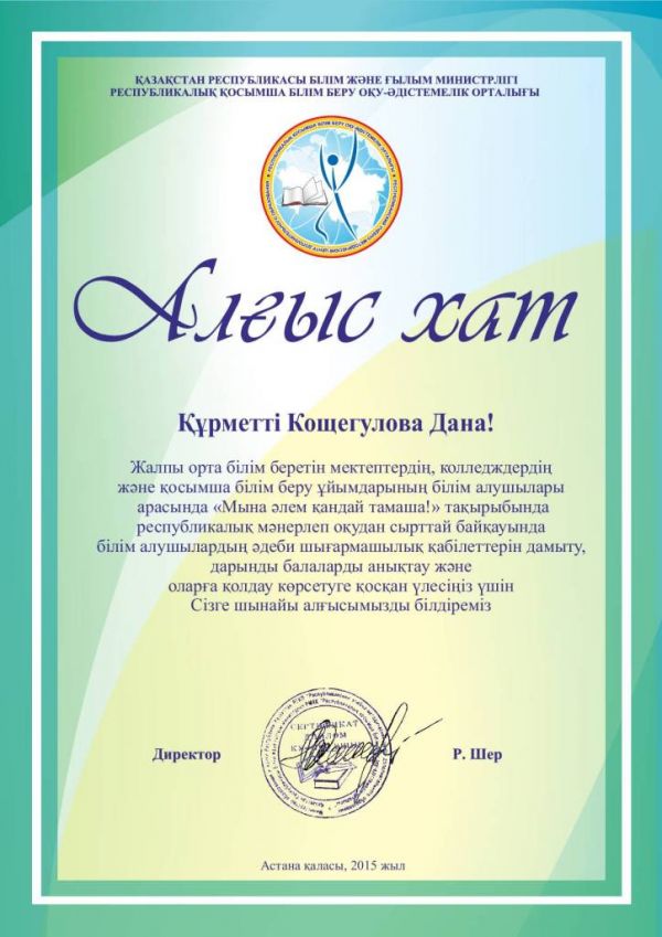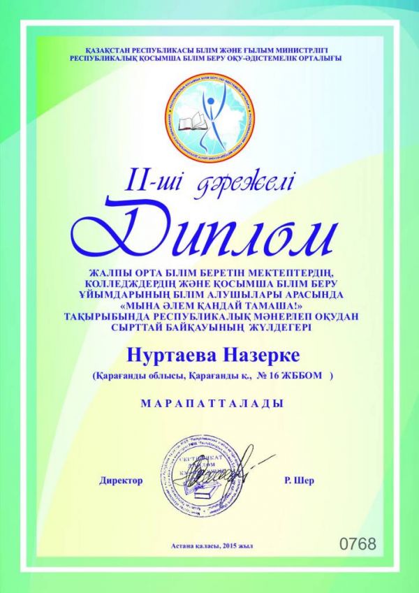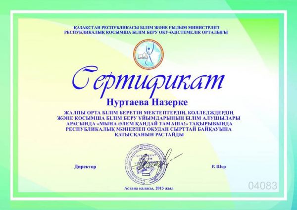 4 сынып оқушыларына арналған "Жыл командасы-2015" интеллектуалдық ойынына қатысқаны үшін Нұрлан Жұлдызға берілді.