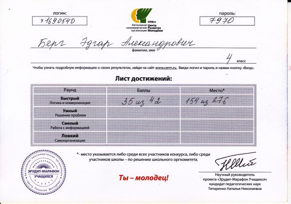 9 сынып оқушысы Лукашевич Александр технология пәні бойынша қалалық олимпиадада "Ағаш шебері" номинациясында мақтау қағазымен марапатталды.