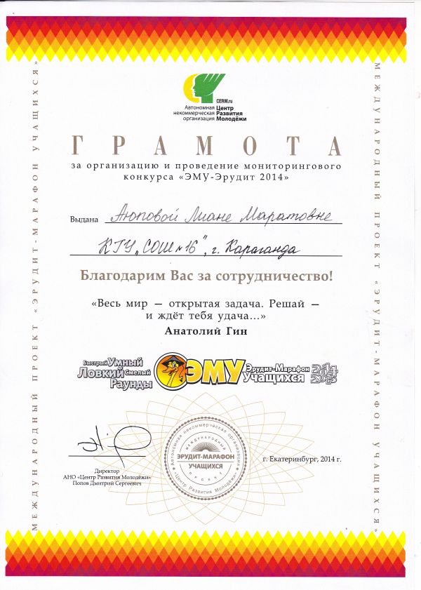 Халықаралық "Мен - зерттеушімін" байқауы шеңберінде бастауыш сынып оқушылары арасында өткен облыстық фестивальдағы үздік оқу-зерттеу жұмысы үшін № 16 ЖББ ОМ 4 сынып оқушысы Летников Дионис…