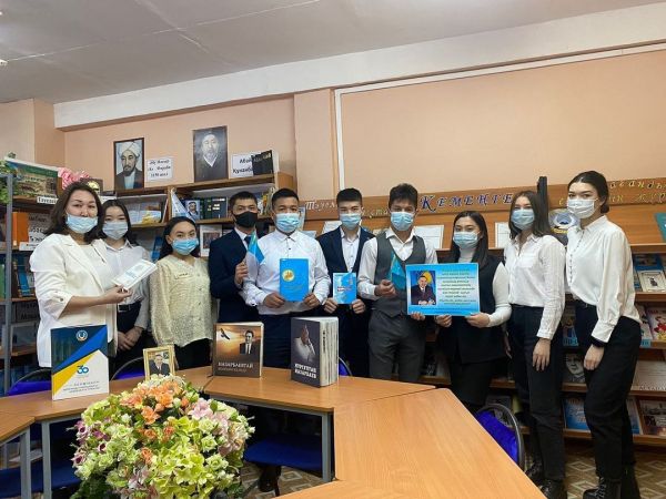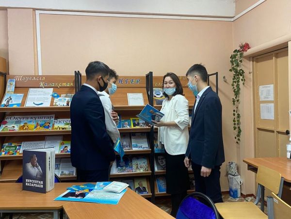 11 "А" сынып оқушыларына Елбасының ел басқару идеясын, кемеңгерлігі мен парасаттылығын насихаттау мақсатында мектеп кітапханасында "Кемеңгер Елбасы" тақырыбы бойынша сынып сағаты…