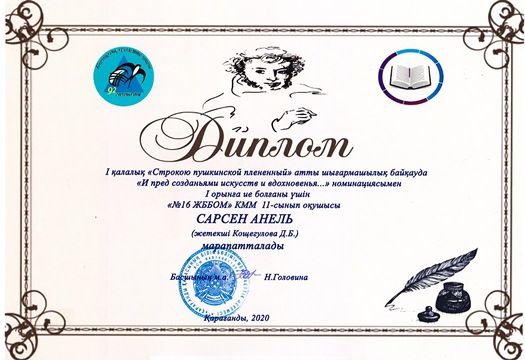 І қалалық "Строкою Пушкинской пленный" атты шығармашылық байқауға мектебіміздің жоғары сынып оқушылары қатысып, жүлделі орындарға ие болды.