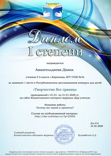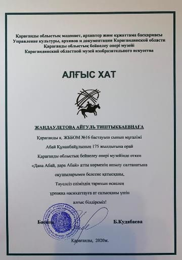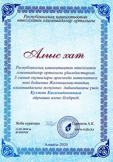 Республикалық қашықтықтан өткізілетін олимпиадасына 3 сынып оқушысы Аман Дінасыл қатысып, І дәрежелі дипломмен марапатталды. Сынып жетекшісі К.К.Дюсенкуловаға алғыс хат берілді.