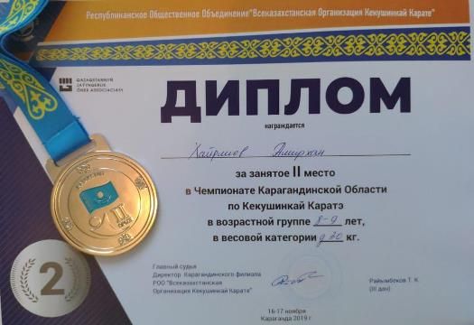 2В сынып оқушысы Хайрлиев Амирхан Кекушинкай каратэден Қарағанды облысының чемпионатында ІІ орынға ие болды.
