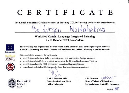 Қазақ тілі мен әдебиеті пәні мұғалімі Р.К.Аятбековаға қашықтық курсынан өткені үшін сертификат берілді.