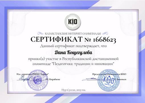 Орыс тілі мен әдебиеті мұғалімі Д. Б. Кощегулова "Педагогика: дәстүрлер мен инновациялар"республикалық қашықтық олимпиадасына қатысты.