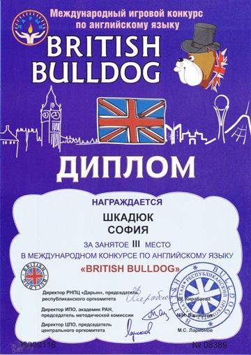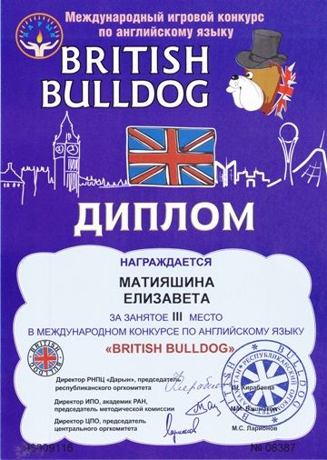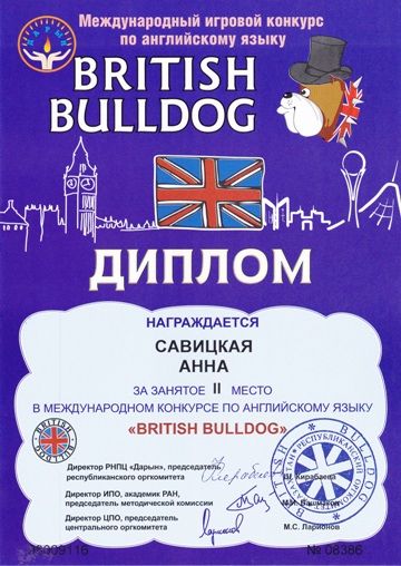 Ағылшын тілінен халықаралық  ''BRITISH BULLDOG'' ойын байқауынан ІІ, ІІІ орын алғаны үшін дипломмен марапатталады  ІІ орын 1.Киева У- 7В сынып 2. Ким Е – 6Б…