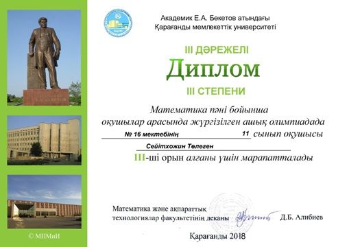 Е.А.Бөкетов атындағы ҚарМУ-нің математика және ақпараттық технологиялар факультетінде  математика пәні бойынша өткен ашық олимпиадада 11А сынып оқушылары Сейітхожин Төлеген ІІІ дәрежелі дипломм…