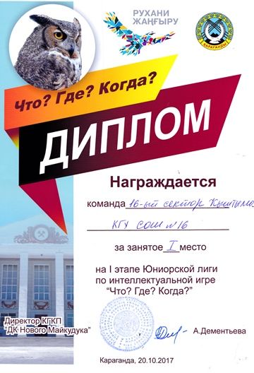 Жасөспірімдер арасындағы "Что? Где? Когда?" зияткерлік ойынының бірінші кезеңінде І орынды иеленгені үшін Кыштыма командасы дипломмен марапатталды