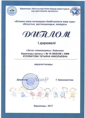 Орыс тілі мен әдебиеті пәнінің мұғалімдері Т.Н.Кузоватова, И.Н.Куркина "Өзіңмен және өзгелермен бейбітшілікте өмір сүру" облыстық дистанциондық конкурсына қатысып, "Эссе" номинац…