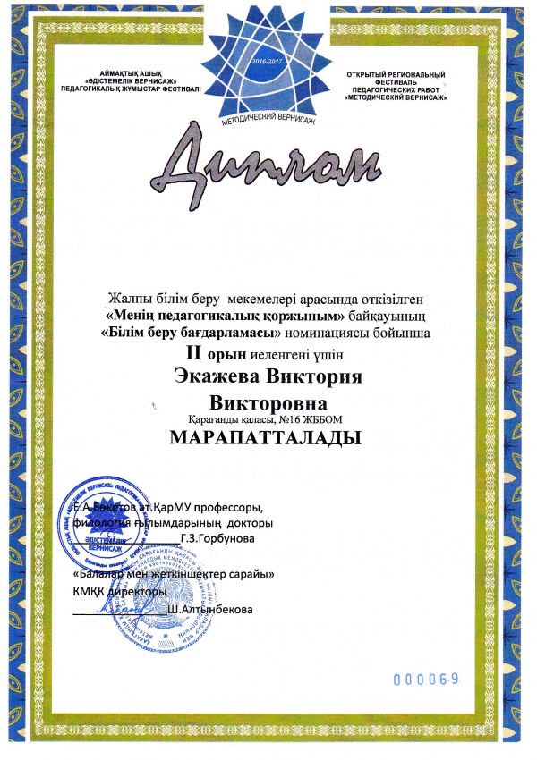 Жалпы білім беру мекемелері арасында өткізілген "Менің педагогикалық қоржыным" байқауының "Білім беру бағдарламасы" номинациясы бойынша тарих пәні мұғалімдері І орын а…
