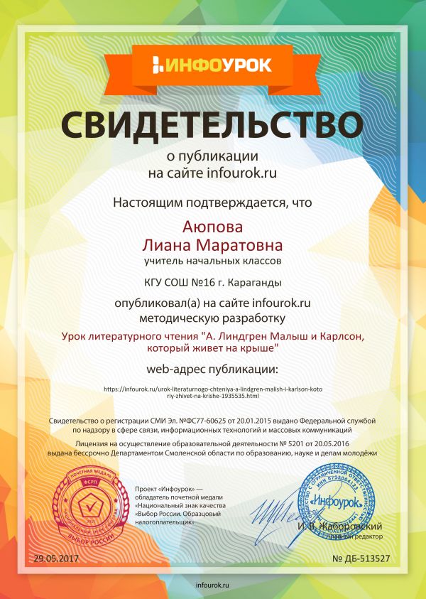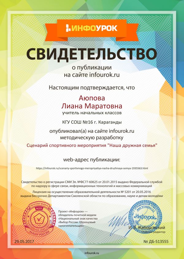 Бастауыш сынып мұғалімі Аюпова Лиана Маратовна InfoUrok.ru сайтына сабақ әзірлемелерін ұсынды