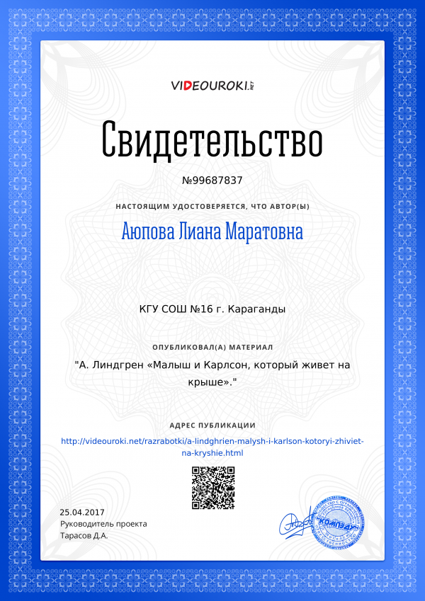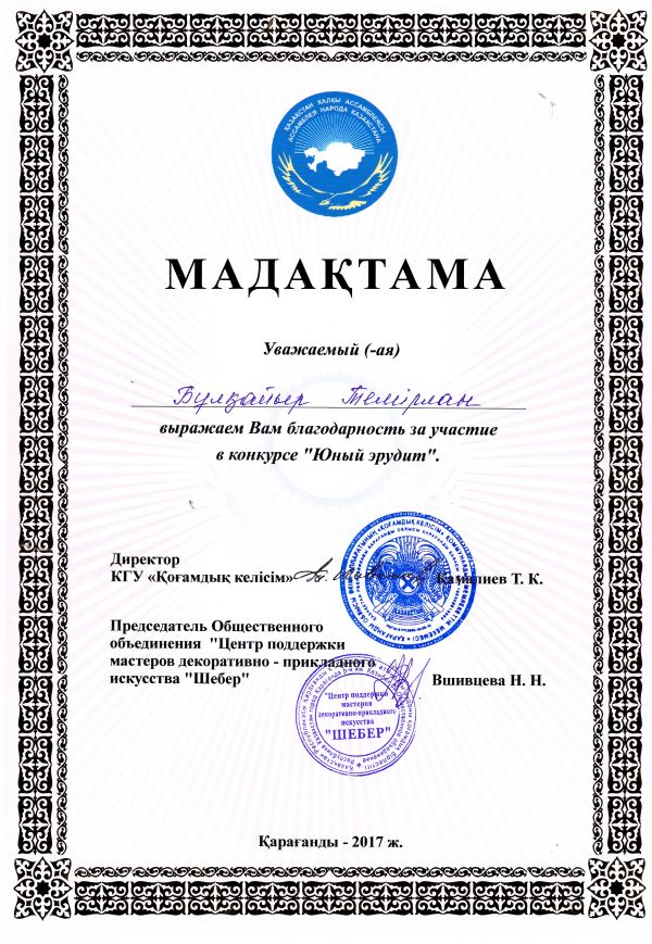 Мектебіміздің 5 сынып оқушысы Жарылқасын Ниязбекке ІІІ қалалық "Танымгер-2017" олимпиадасына қатысқаны үшін сертификат берілді.