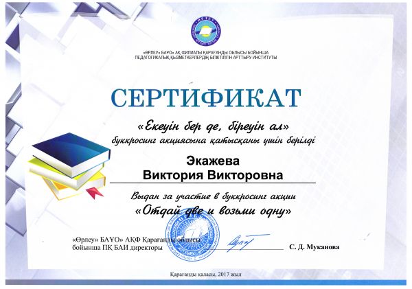 "Екеуін бер де, біреуін ал" буккросинг акциясына қатысқаны үшін тарих пәні мұғалімі Экажева Виктория Викторовнаға берілді