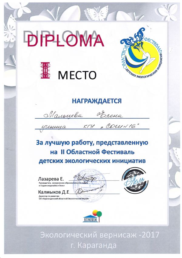Мальцева Елена балалардың экологиялық бастамалардың ІІ облыстық фестивалінде ІІІ дәрежелі дипломмен марапатталды, Жетекшісі Струнина Валентина Константиновна алғыс хат алды