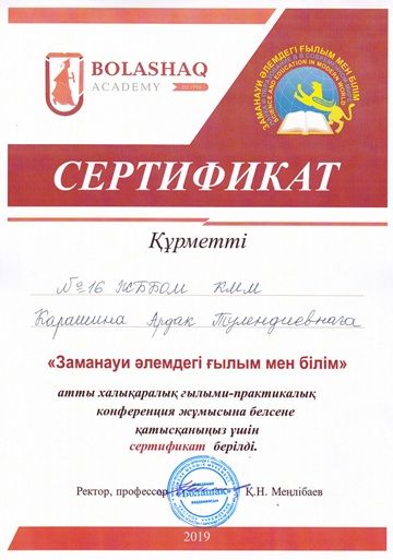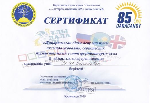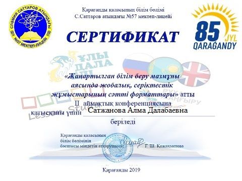 "Жаңартылған білім беру мазмұны аясында жобалық, серіктестік жұмыстарының сәтті форматтары" атты ІІ аймақтық конференциясына қатысқаны үшін қазақ тілі мен әдебиеті пәні мұғалімі А.Д.Сатжан…