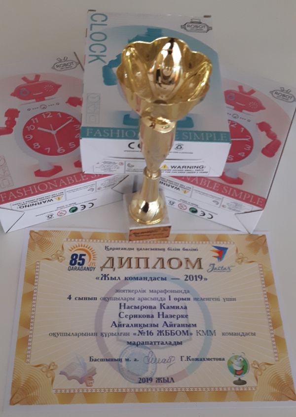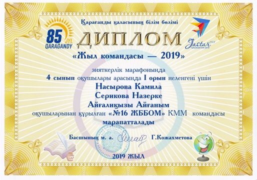 "Жыл командасы-2019" зияткерлік марафонында 4 сынып оқушылары арасында І орынды иеленді.