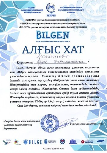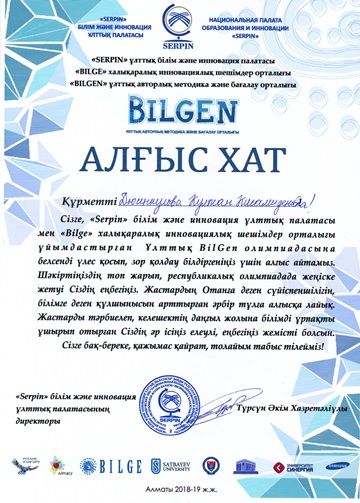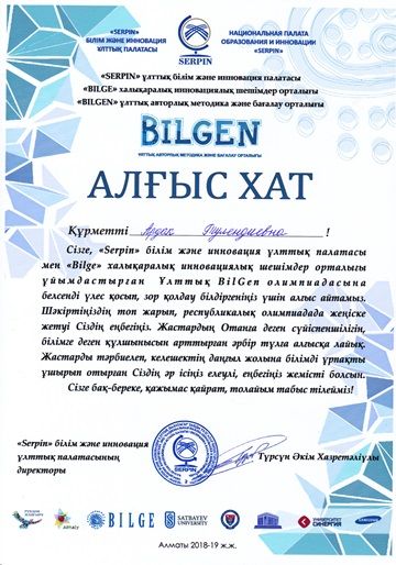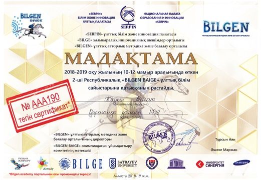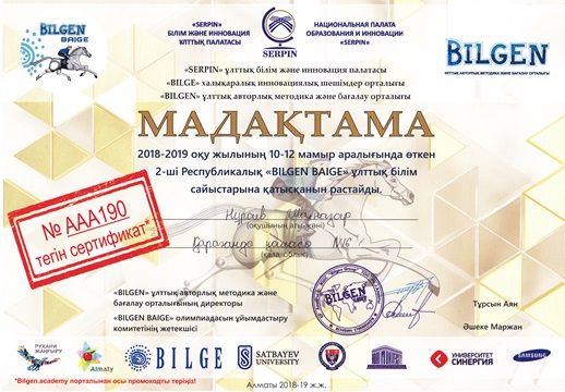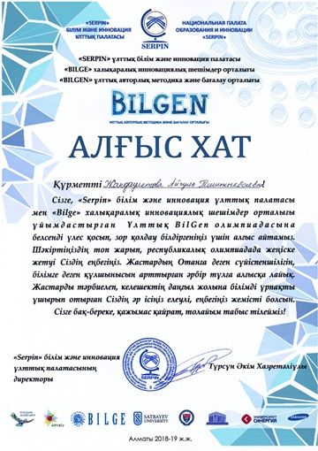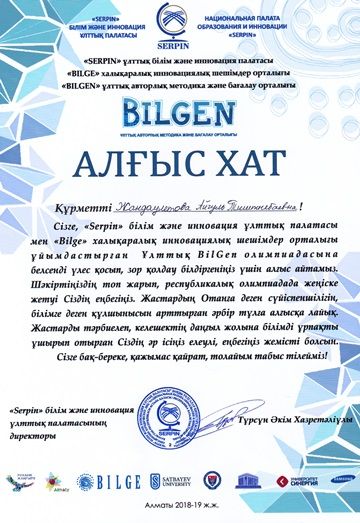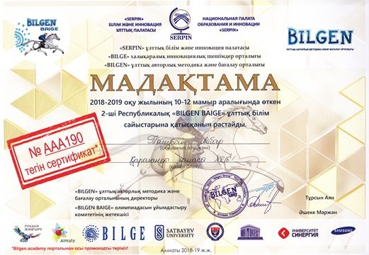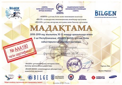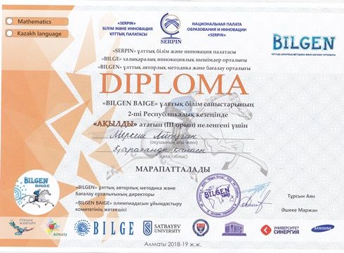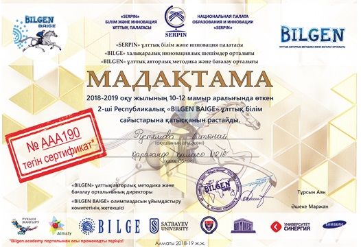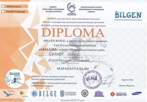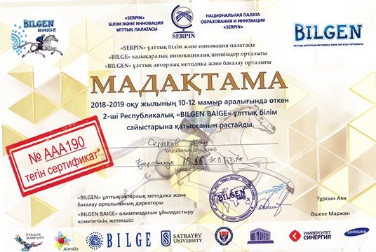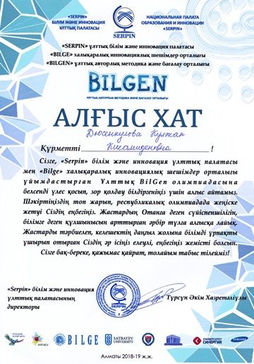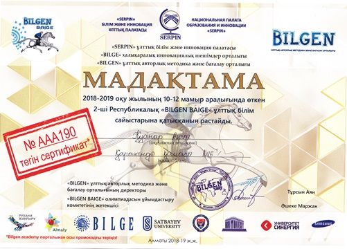 Бастауыш сынып оқушылары 2018-2019 оқу жылының 10-12 мамыр аралығында өткен 2-ші  Республикалық "BILGEN BAIGE"  ұлттық білім сайысына қатысып, мадақтамаларға ие болды. Сынып жете…