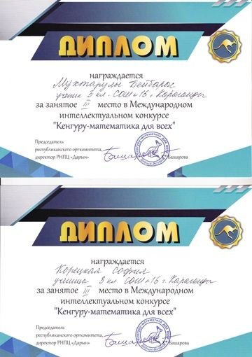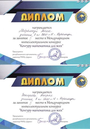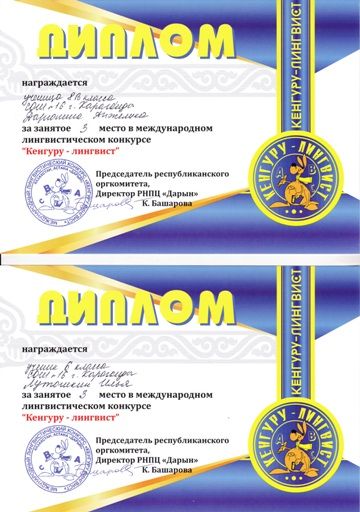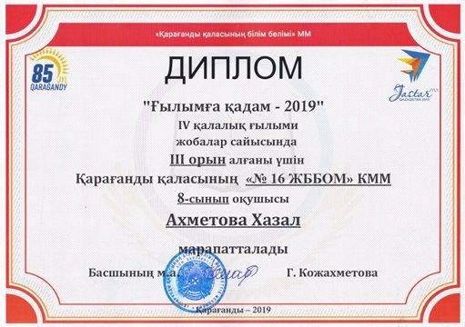 "Ғылымға қадам-2019" IV қалалық ғылыми жобалар сайысында мектебіміздің оқушылары ІІІ орынға ие болды. 1. Ахметова Хазал 2. Фомина Ксения