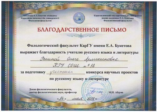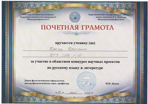 Почетная грамота ученице 11В класса Кригер Кристине за участие в областном конкурсе научных проектов по русскому языку и литературе. Благодарность за подготовку участника учителю русского языка и ли…