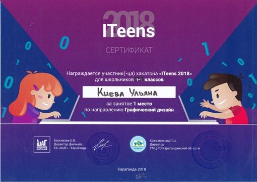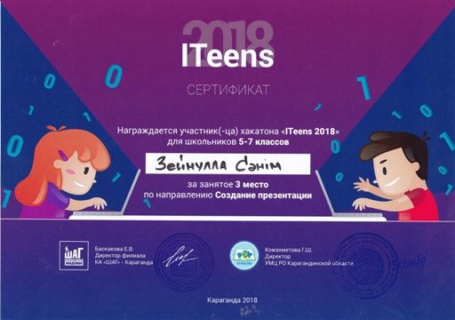 Ученики 6-7 классов награждены сертификатами за участие в хакатоне "ITeens 2018" для школьников 5-7 классов по направлению Создание презентации.