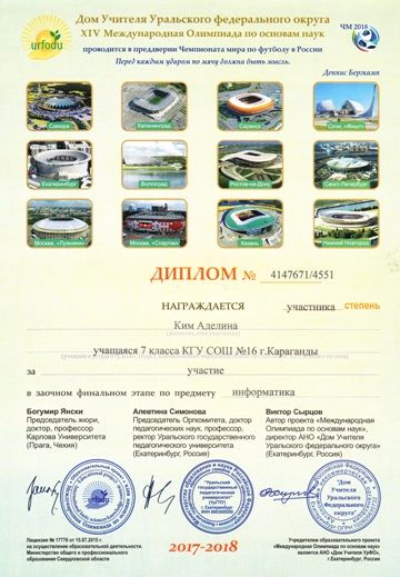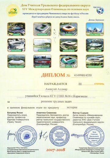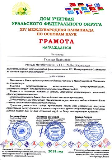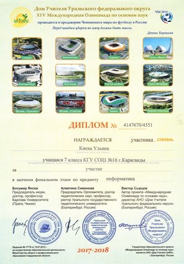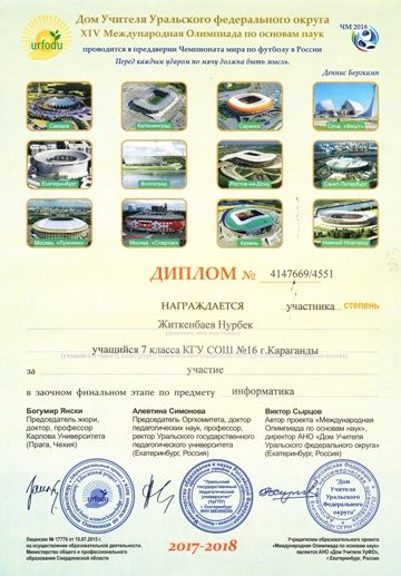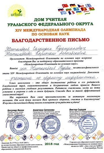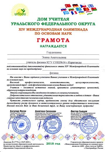 Дипломами награждены учащихся 7-11 классов за участие XIV международной олимпиады по основам наук.