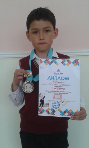 Ученик 3Ә класса Азаматұлы Абдуазим награжден дипломом за занятое ІІ место в Весенней Региональной Олимпиаде по ментальной арифметике.