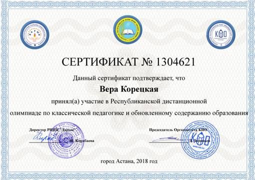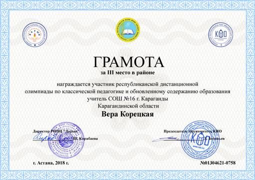 Учителя В.Корецкая, Т.Деткова, Л.Виноградова награждены за участие в республиканской дистанционной олимпиады по классической педагогике и обновленному содержанию.