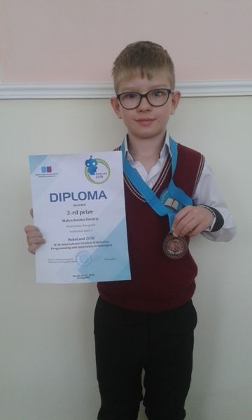 Ученик 4Б класса Малюченко Дмитрий награжден дипломом за участие IV-го Международном фестивале по робототехнике, программирования и инновационных технологий "RoboLand 2018".